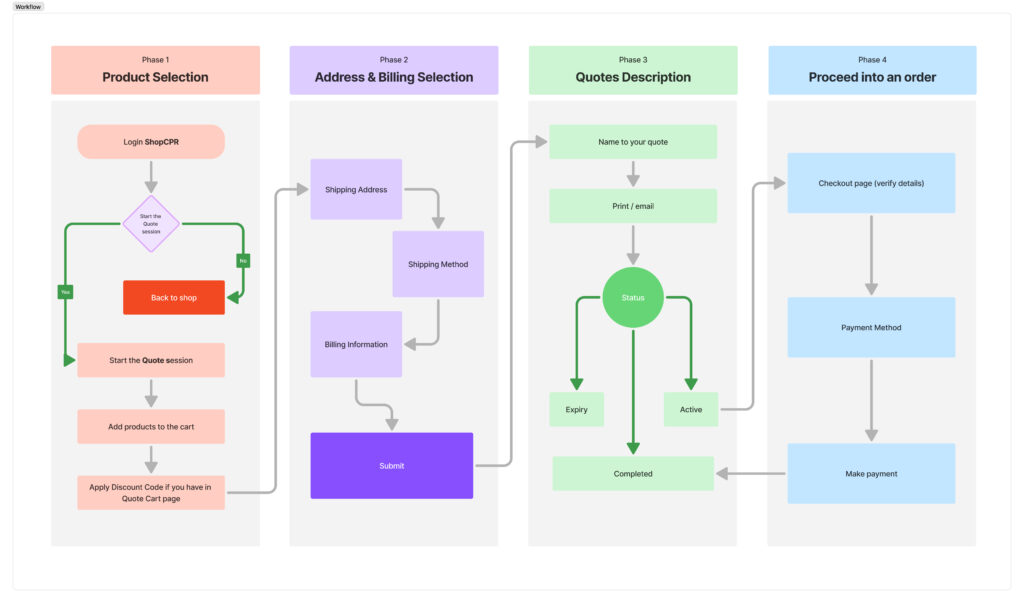 • Map the full journey: From “Need CPR materials” → “Find & Add cart” → “Request quote” → “Place bulk order” → “Reorder/manage quote history.”